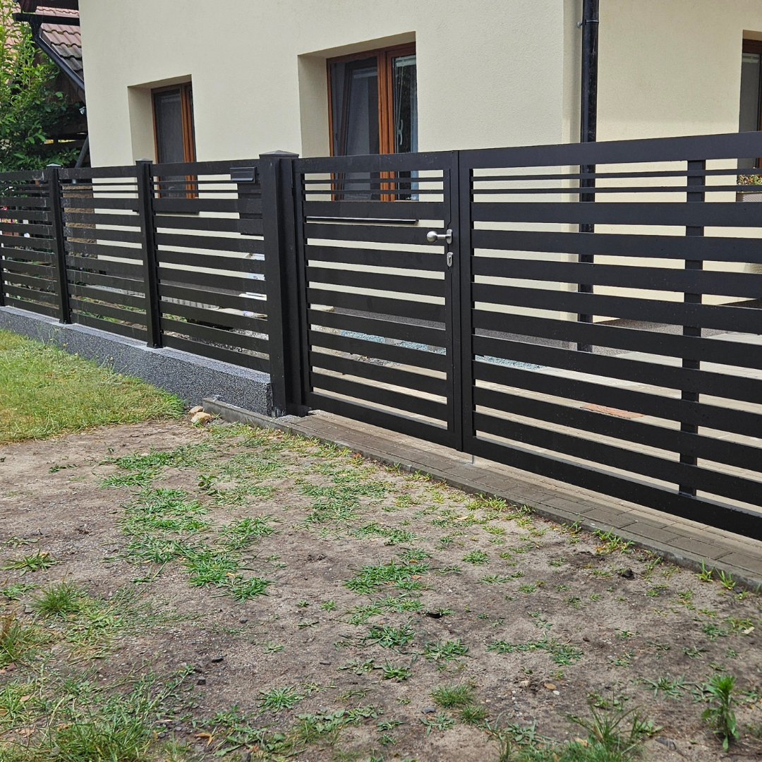 V Bělči nad Orlicí jsme realizovali hliníkové oplocení v unikátním atypickém combi motivu (kombinace PPH80 a PPH2). Celý projekt je laděn do elegantní černé kovářské barvy. Tato zakázka byla specifická hned několika technickými detaily: asymetrickým provedením dvoukřídlé brány a integrací revizních dvířek pro HUP a elektro přímo do plotového pole. Pro zajištění maximální tuhosti a dlouhé životnosti jsme u brány použili zesílenou konstrukci z nestandardních profilů.