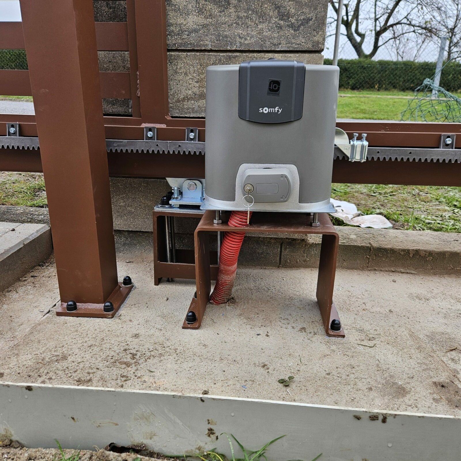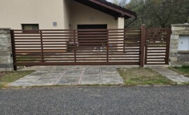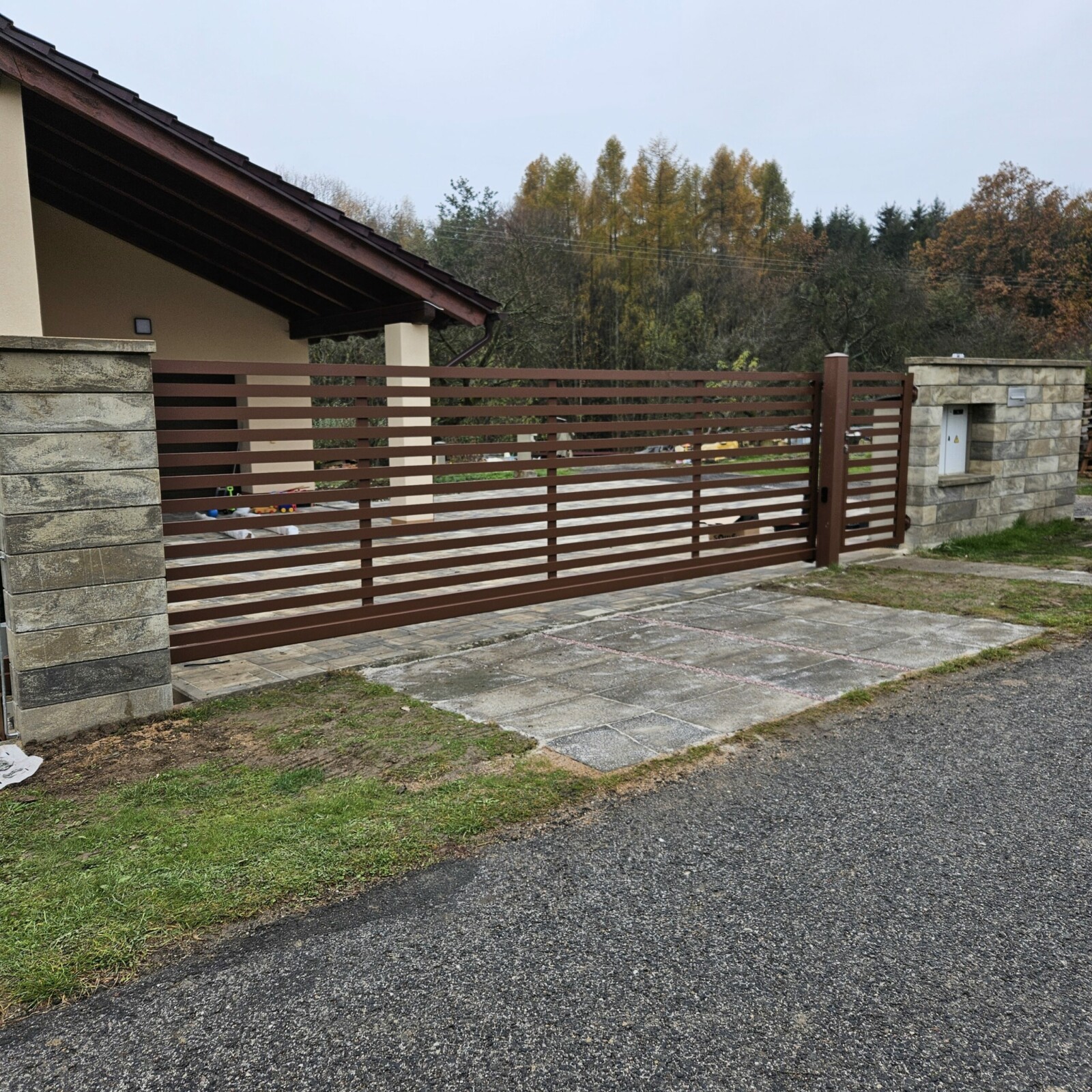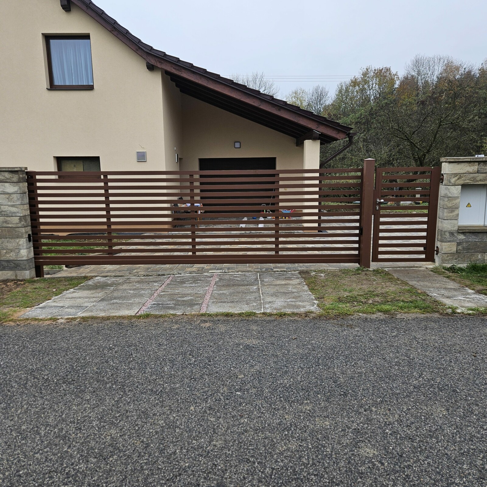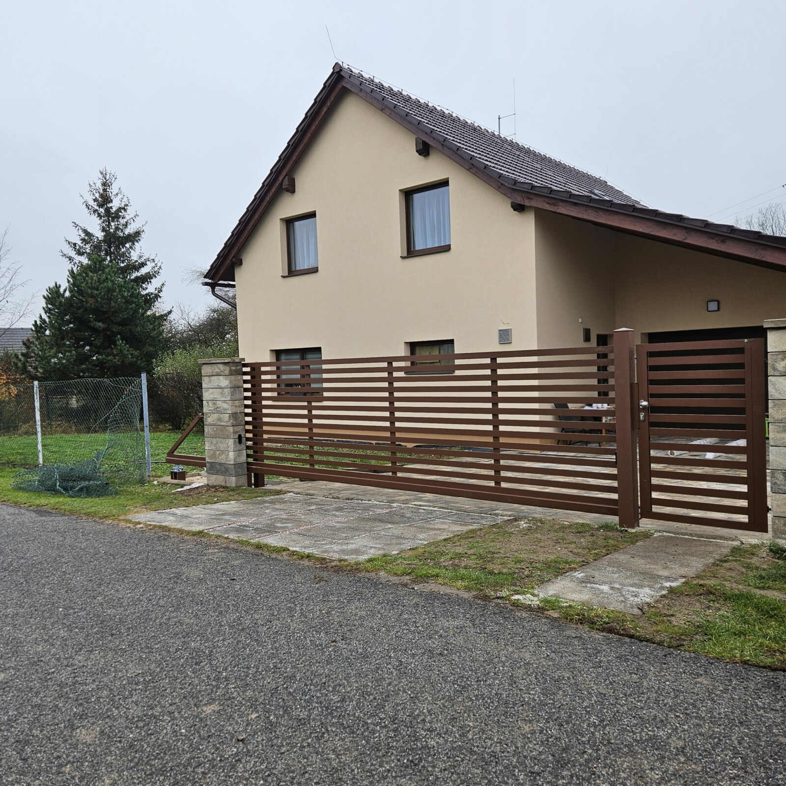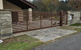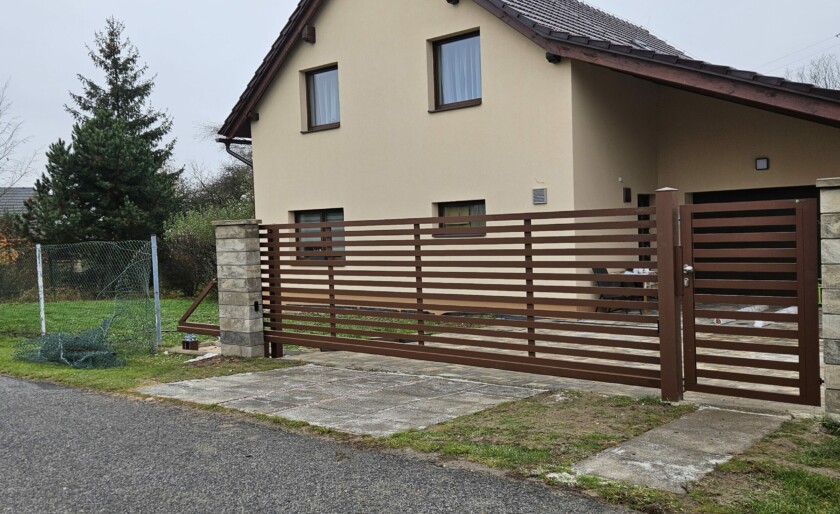 V Bukvici jsme realizovali kvalitní hliníkové oplocení s konstrukcí PPH60 v přírodním odstínu oříškové hnědé (RAL 8011). Tato barva dodává plotu přirozený a nadčasový vzhled, který dokonale ladí s okolním prostředím a především s architekturou domu. Celý systém oplocení zahrnuje samonosnou bránu, vchodovou branku a pevné sloupky, které zajišťují stabilitu a dlouhou životnost. Součástí realizace byl také výřez s dvířky na magnet HUP, který umožňuje snadný přístup k uzávěru plynu. Ovládání brány usnadňuje spolehlivý pohon Somfy Elixo, který zajišťuje pohodlné a bezpečné používání.