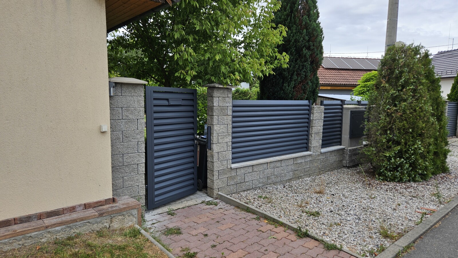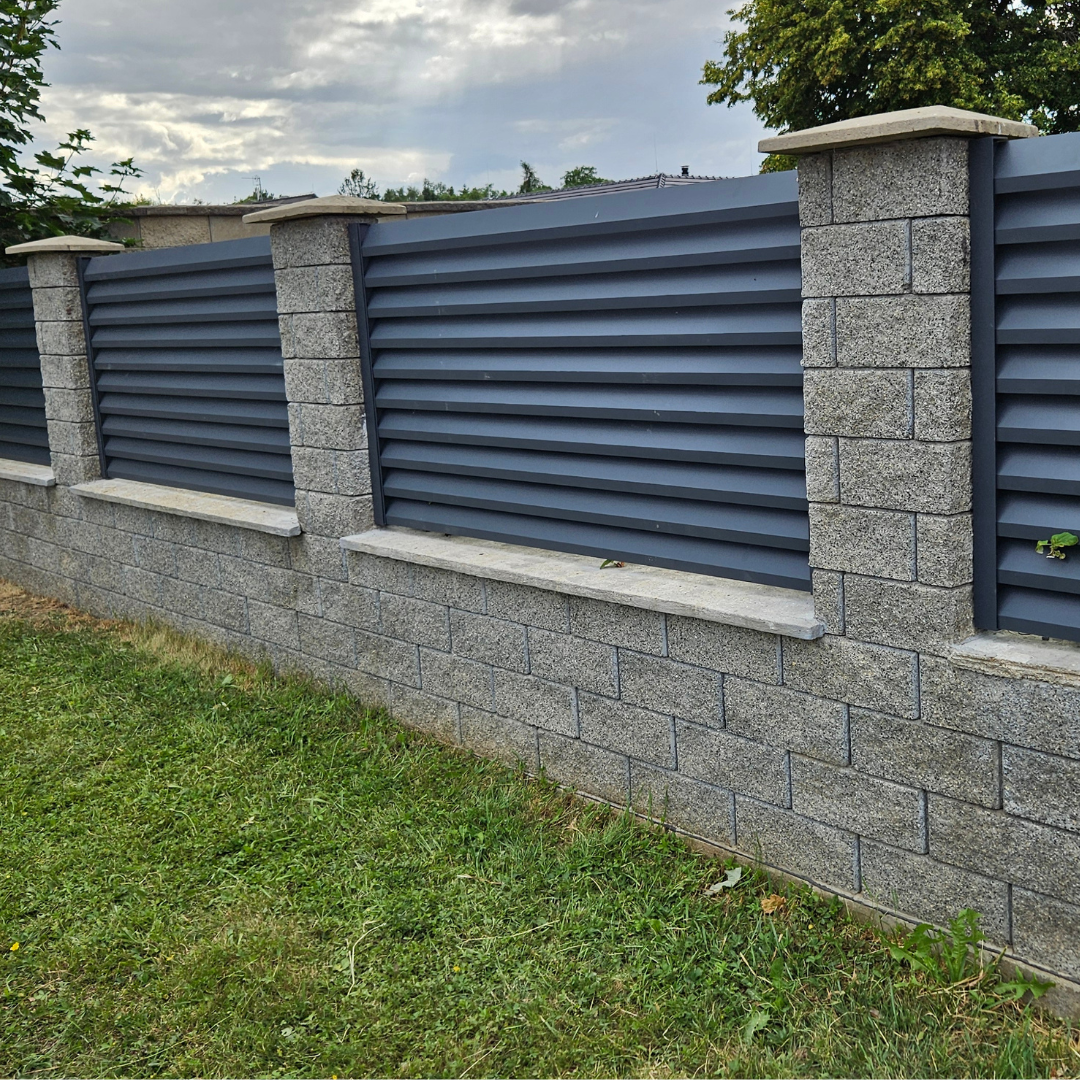 V obci Doksy u Kladna jsme dokončili členitou realizaci hliníkového oplocení v konstrukci PPH1 a barvě RAL 7016 (antracit). Tato zakázka kladla vysoké nároky na přesné zaměření a výrobu kvůli velkému množství plotových polí různých rozměrů a nutnosti integrovat revizní prvky. Součástí dodávky byla kolejnicová brána a branka s integrovanou schránkou. Technickou zajímavostí je zpevněné plotové pole s rámem pro výřez a speciální dvířka pro přístup k inženýrským sítím.