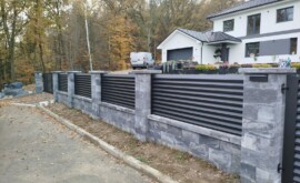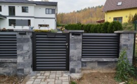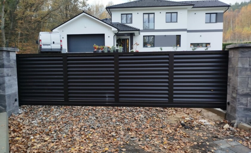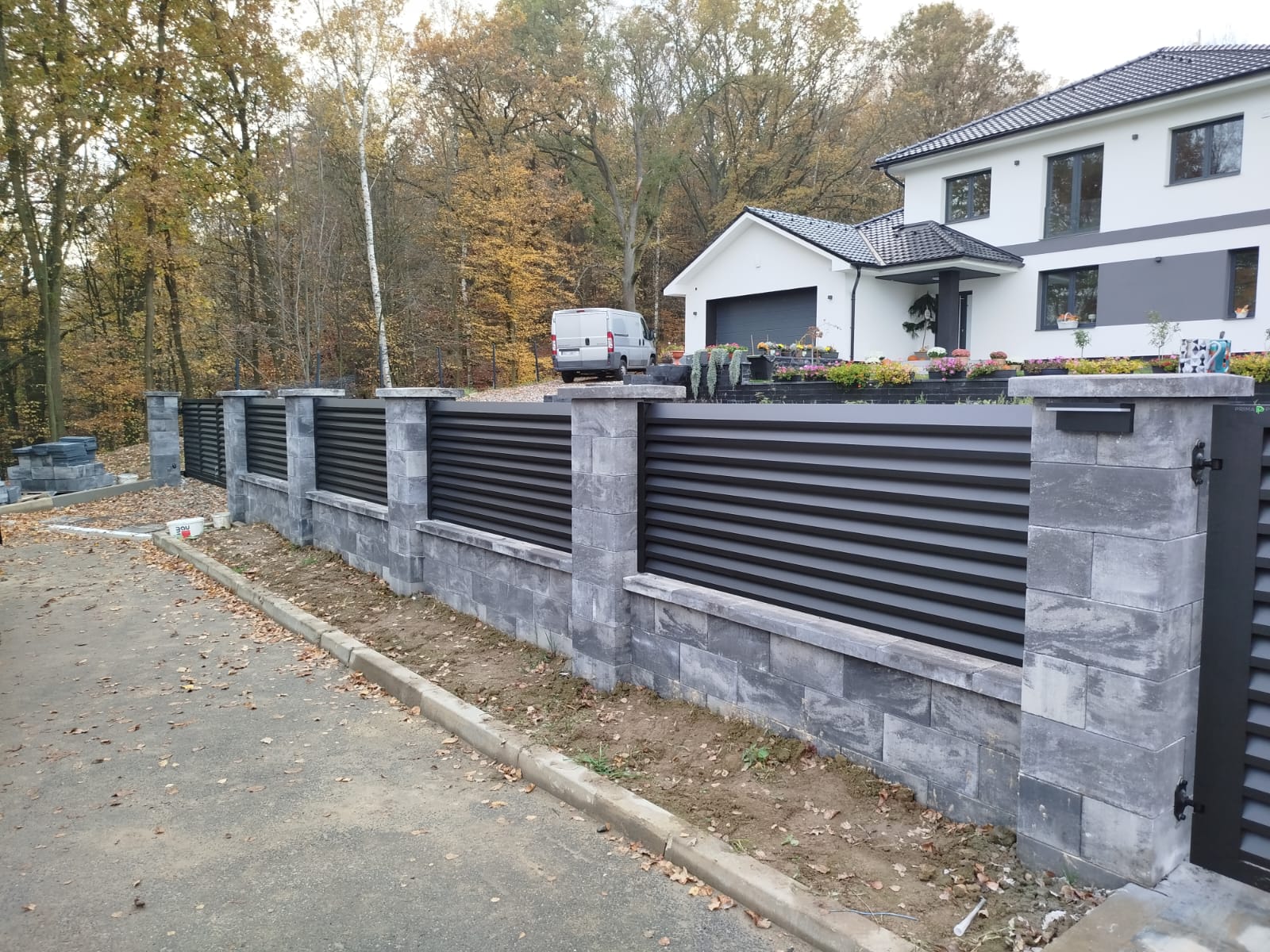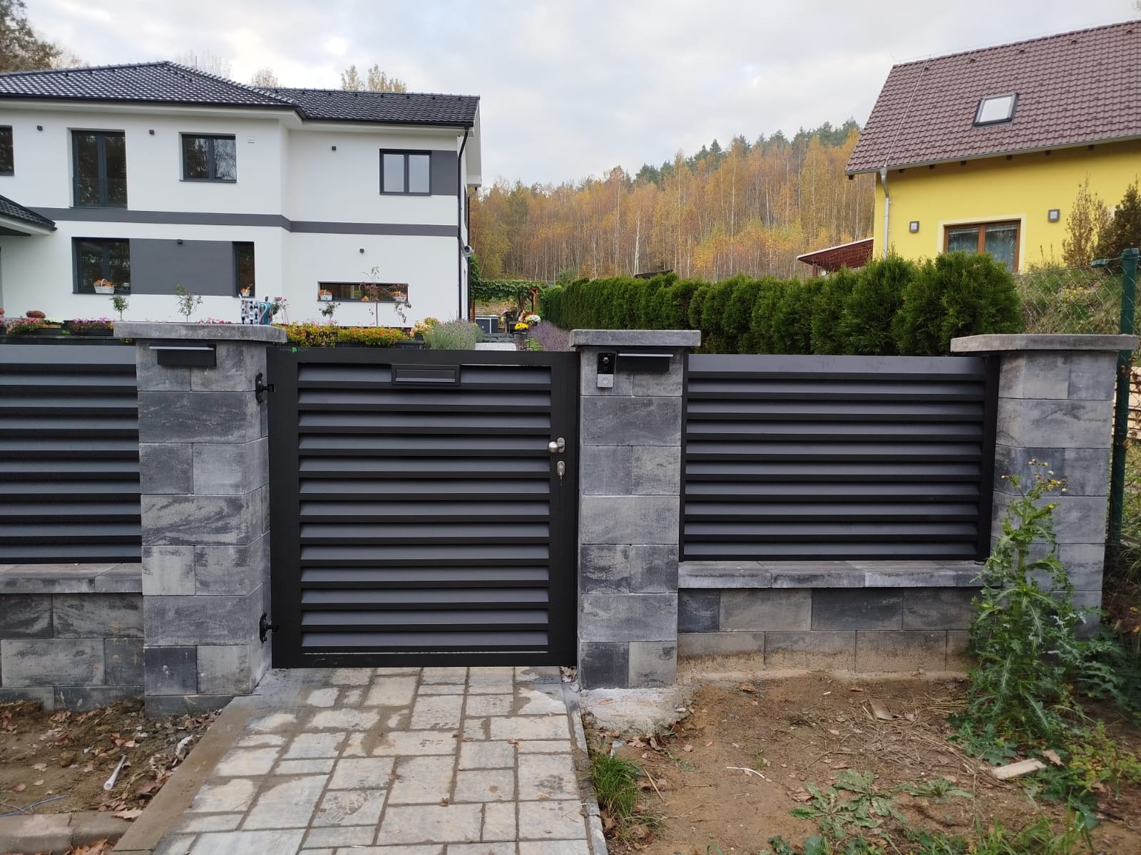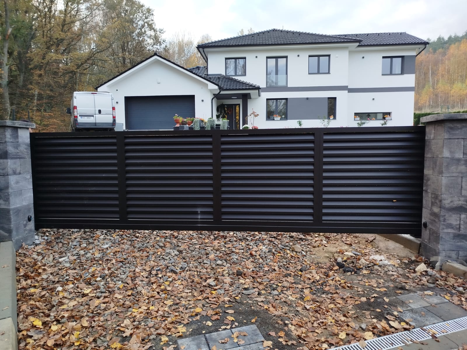 V Ludvíkovicích jsme instalovali moderní hliníkové oplocení v kovářské černé, které dodává objektu nadčasový vzhled. Hlavní dominantou projektu je samonosná brána o délce 5 metrů, která zajišťuje pohodlný vjezd na pozemek. Celá konstrukce je kotvená přes zámkovou dlažbu, což vyžadovalo precizní montáž a dokonalé sladění s terénem.