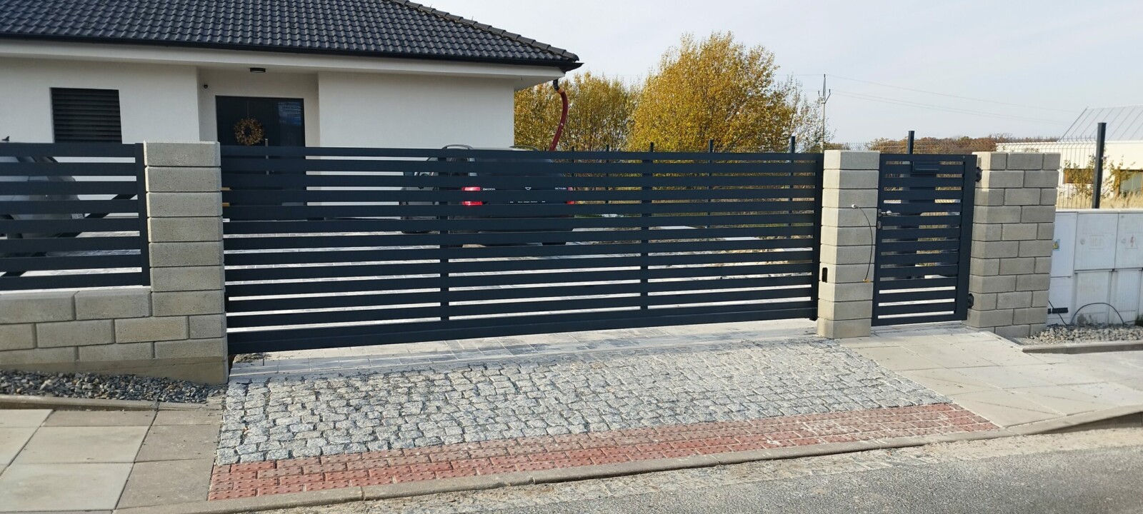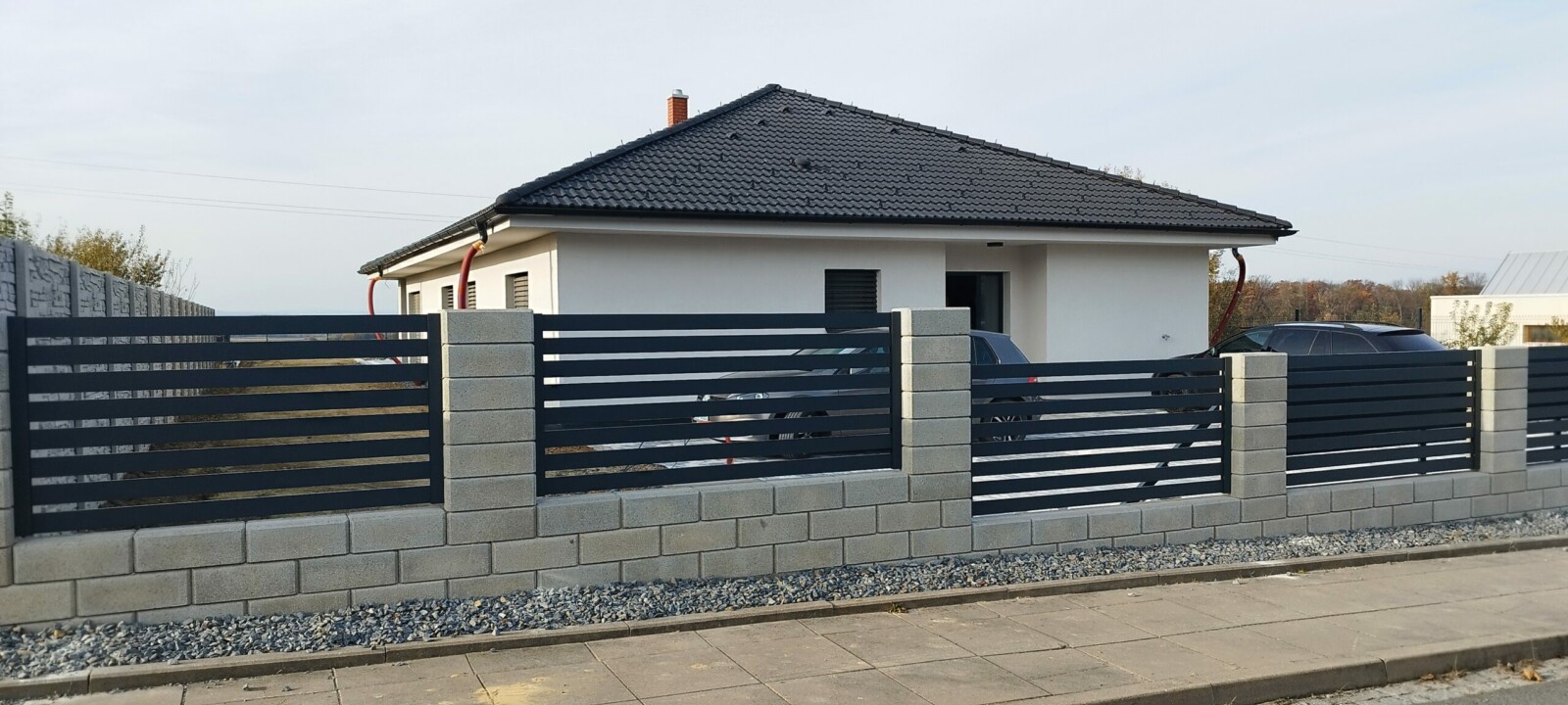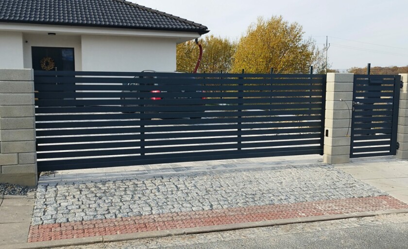 V Raduni jsme dokončili realizaci kvalitního hliníkového oplocení s konstrukcí PPH80 v odstínu šedé antracitové (RAL 7016). Projekt byl navržen s důrazem na estetiku i funkčnost. Realizace zahrnuje samonosnou bránu, vchodovou branku a výrazné plotové dílce, které dohromady vytvářejí harmonický celek. Spolehlivý pohon Somfy Elixo 5003S zajišťuje pohodlné a spolehlivé otevírání brány a prvky, jako GSM modul a speciální podložky pod pohon i pod vozíky, zvyšují komfort a stabilitu celého systému oplocení.