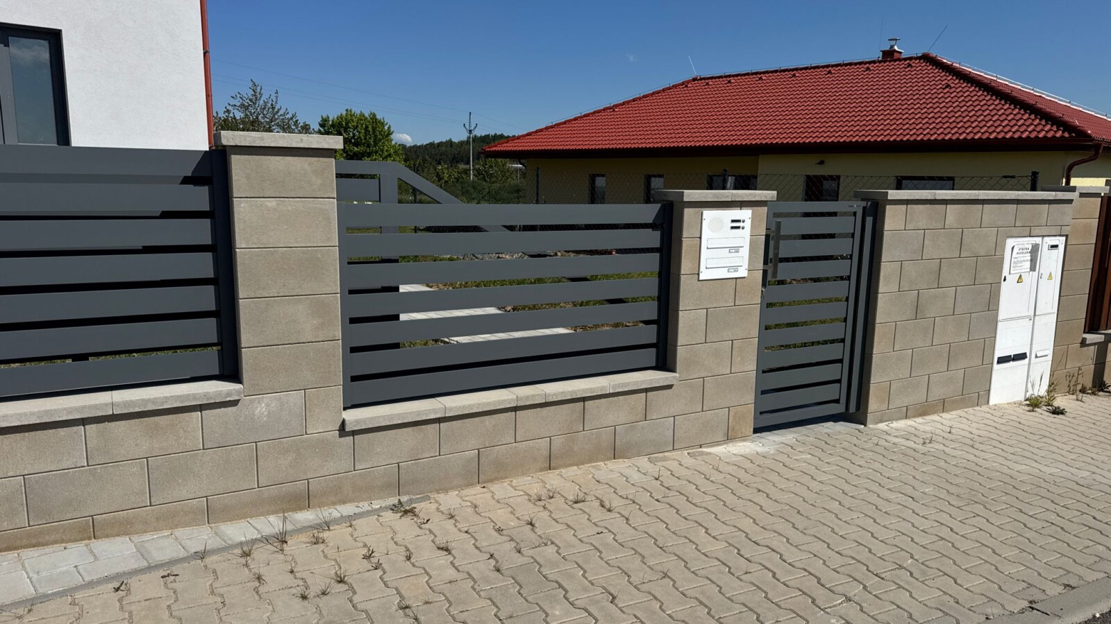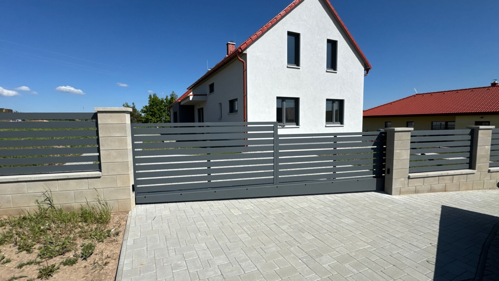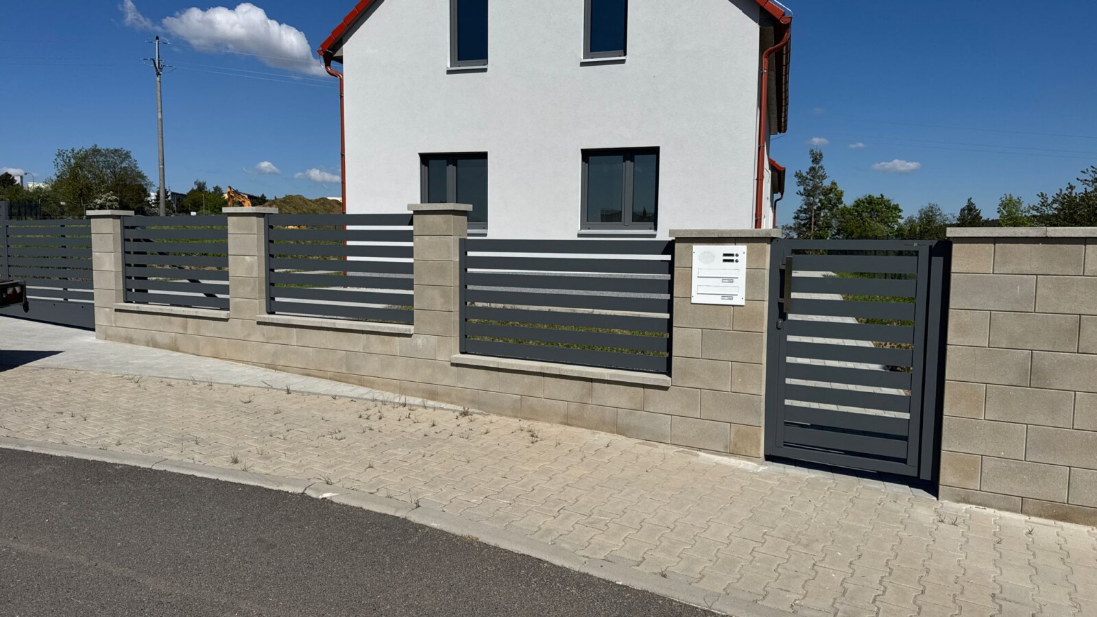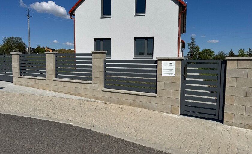 V Rakovníku jsme dokončili instalaci hliníkového oplocení, v rámci jehož návrhu jsme se museli popasovat se sklonem terénu. S motivem PPH100 a čedičovou šedou barvou (RAL 7012) namíchanou na přání majitele se tento plot stal neoddělitelným prvkem nemovitosti. Horizontálně orientované lamely s šířkou 100 mm působí vzdušně a opticky rozšiřují prostor pozemku. I přes náročnost terénu se povedlo vytvořit funkční a zároveň krásný plot s automatickou samonosnou bránou a vchodovou brankou. Celé oplocení je vysoce kvalitně zpracované a skvěle zapadá do architektury svého okolí.